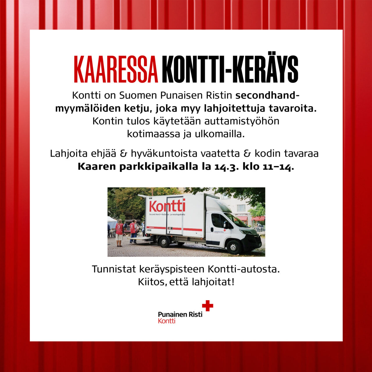 Kontin keräysauto tulee 14.3. klo 11-14 kauppakeskus Kaaren parkkipaikalle. Tunnistat keräyksen helposti automme Kontti-logosta. Keräyksen järjestää SPR Helsingin Kontti secondhand- myymälä.