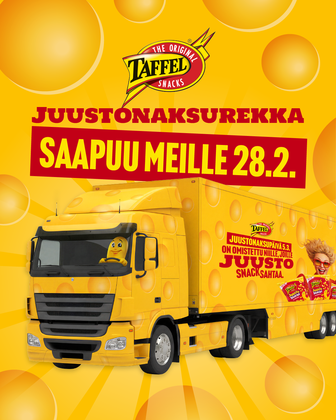 Tervetuloa Taffelin Juustonaksurekkaan Kaaren ulkoparkkipaikalle lauantaina 28.2. klo 10-15! Kokeile onneasi juustoisessa onnenpyörässä, tutustu fanituotteisiin ja nauti snacksahtavasta tunnelmasta. 50 ensimmäiselle luvassa mysteerikassi!